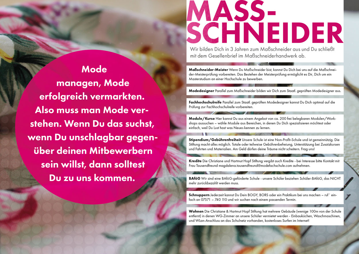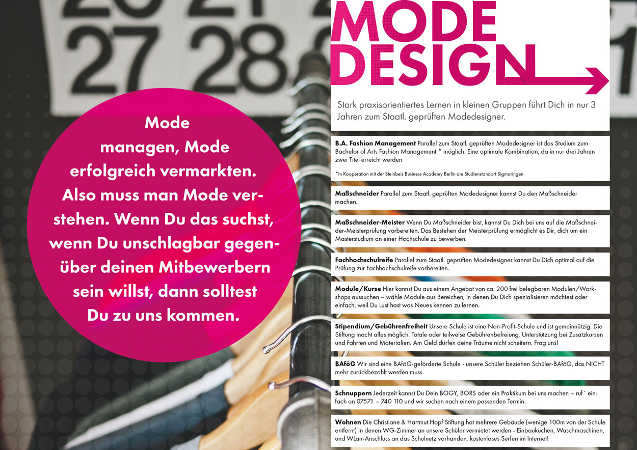 Für die Modefachschule Sigmaringen wurde in enger Zusammenarbeit mit der Schulleitung ein komplett ausgearbeiteter Entwurf für eine neue Website erstellt. Im Anschluss daran, wurde noch ein Blog für die Schüler eingerichtet.